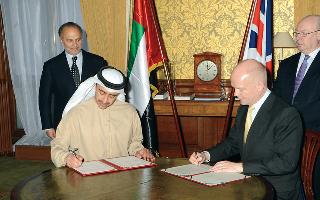 جاء ذلك خلال توقيع حكومة دولة الامارات العربية المتحدة وحكومة المملكة المتحدة لبريطانيا العظمى وايرلندا الشمالية في لندن أمس على مذكرتي تفاهم الاولى بشأن إنشاء "حوار القيم" والثانية حول "منظومة المؤهلات"، وقد وقع المذكرتين عن جانب الامارات سمو الشيخ عبدالله بن زايد آل نهيان وزير الخارجية وعن جانب حكومة المملكة المتحدة لبريطانيا العظمى وايرلندا الشمالية وليام هيغ وزير الخارجية. ويأتي توقيع مذكرتي التفاهم بمناسبة الزيارة الرسمية التي يقوم بها صاحب السمو الشيخ خليفة بن زايد آل نهيان رئيس الدولة، حفظه الله، إلى المملكة المتحدة لبريطانيا العظمى وايرلندا الشمالية حاليا تلبية لدعوة الملكة إليزابيث الثانية والأمير فيليب دوق أدنبرة.