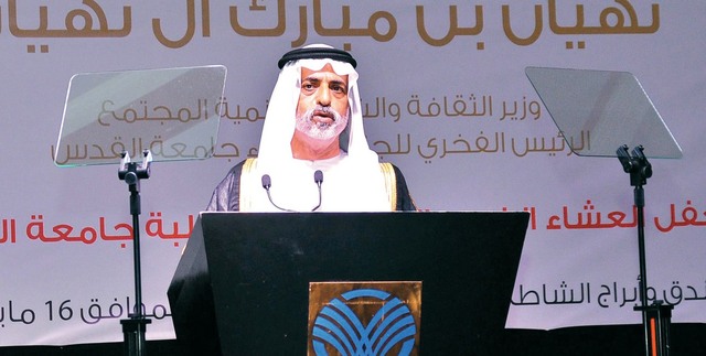 جدد معالي الشيخ نهيان بن مبارك آل نهيان وزير الثقافة والشباب وتنمية المجتمع الرئيس الفخري للجنة أصدقاء جامعة القدس في أبوظبي وقوف الإمارات إلى جانب شعب فلسطين تناصر قضيته العادلة وتدعم كل ما يقوم به على طريق الحق والعدل والسلام.