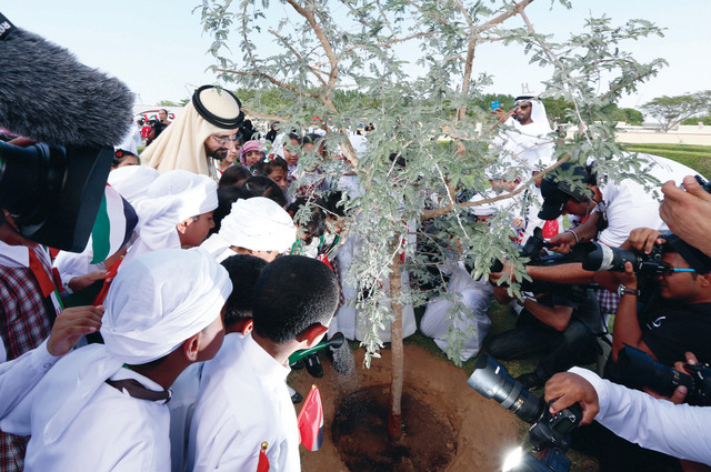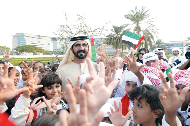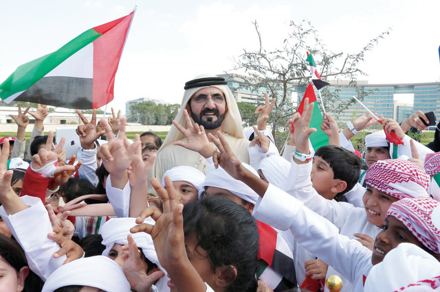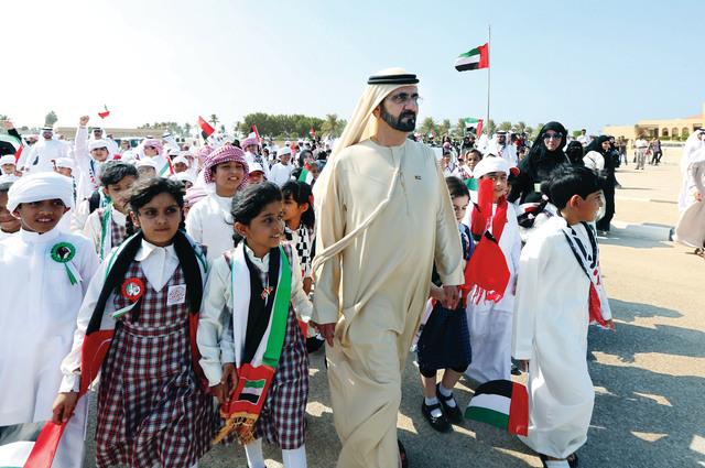 وسقى صاحب السمو الشيخ محمد بن راشد آل مكتوم برفقة مجموعة من الطلاب والطالبات شجرة الاتحاد التي غرسها قبل عام، وخاطب سموه الطلاب قائلا: "أقسمنا أن نعمل بإخلاص من أجل وطننا.. مهما عشنا نخلص نخلص، كل مواطن في عمله أو في دراسته أو في معسكره هو جندي لهذا الوطن، الوطن هو ما يجمعنا ويوحدنا ويعطينا الدافع ليكون كل يوم أفضل من الذي قبله وكل عام أحسن من الذي سبقه وكل إنجاز أعظم وأفضل وأجمل دائما".
