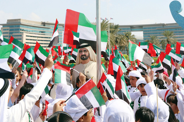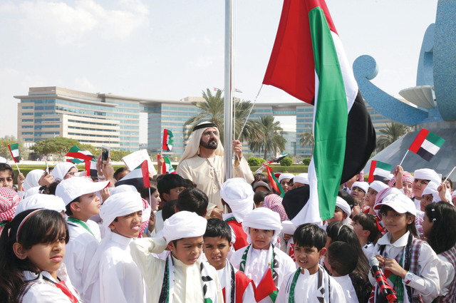 شهدت دولة الإمارات العربية المتحدة لحظات تاريخية ظهر يوم أمس في تمام الساعة الثانية عشرة ظهراً حيث التف شعب الإمارات وقيادته حول علم الدولة ووقفوا له في وقت واحد وهتفوا بنداء واحد وقلب واحد "دام الأمان وعاش العلم يا إماراتنا"، تقدمهم في ذلك صاحب السمو الشيخ محمد بن راشد آل مكتوم نائب رئيس الدولة رئيس مجلس الوزراء حاكم دبي، رعاه الله، في دار الاتحاد وفي نفس الموقع الذي رفع فيه الآباء المؤسسون العلم قبل أكثر من 42 عاماً ليعلنوا أن هذا العلم الواحد هو ما يمثل جميع أبناء هذا الشعب ولا شيء غيره".