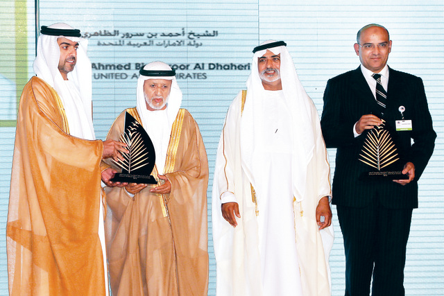 وتسلم سمو الشيخ حامد بن زايد آل نهيان رئيس ديوان ولي عهد ابوظبي عضو المجلس التنفيذي لامارة ابوظبي، الشهادة من الدكتور جوزيه غرازيانيو دا سيلفا مدير عام منظمة الأغذية والزراعة الدولية "فاو" خلال حفل تكريم الفائزين بجائزة خليفة الدولية لنخيل التمر في دورتها السادسة امس.