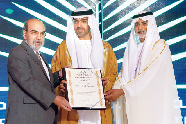 أهدت منظمة الاغذية والزراعة الدولية "فاو" دولة الامارات شهادة تقدير كونها من بين الدول الـ17 الأولى في العالم النامي التي حافظت على أفضل معدل انتشار نقص التغذية إلى أقل من 5% بين عامي 1990 و2013 وهو المؤشر 1.9 ضمن الأهداف الإنمائية للألفية الثالثة التي أقرها برنامج الأمم المتحدة الإنمائي.