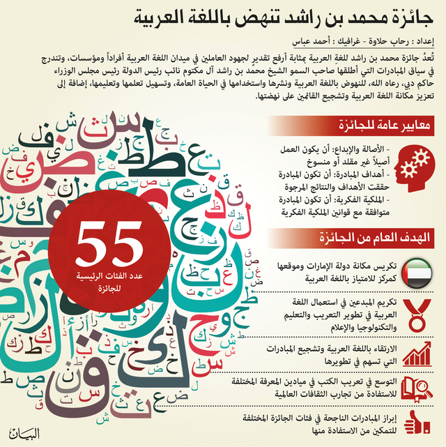وأفضل تجربة تعليمية وأفضل مبادرة لنشر اللغة العربية لغير الناطقين بها، وأفضل مشروع تعريب وأفضل مشروع لنشر القراءة وأفضل التطبيقات الذكية الداعمة للغة العربية، ما سيحقق نقلة نوعية في تدريس اللغة العربية على المستوى العالمي.