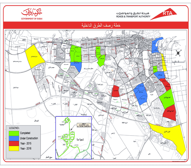 أنجزت هيئة الطرق والمواصلات في دبي رصف طرق داخلية في 13 منطقة سكنية، بكلفة بلغت 552 مليون درهم.
