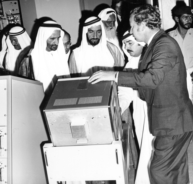 صاحب السمو الشيخ زايد بن سلطان آل نهيان رئيس الدولة، وصاحب السمو الشيخ راشد بن سعيد آل مكتوم نائب رئيس الدولة حاكم دبي، يستمعان إلى شرح عن أحد الاجهزة في محطة الاتصالات بالأقمار الصناعية بجبل علي، عقب الافتتاح ويبدو بالصورة صاحب السمو الشيخ راشد بن حميد النعيمي حاكم عجمان.