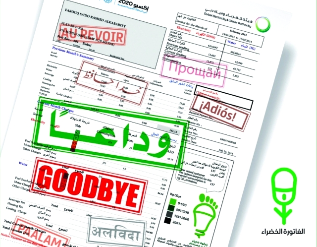 أوقفت هيئة كهرباء ومياه دبي التعامل بالفاتورة الورقية وبدأت في استخدام الفاتورة الخضراء بشكل كلي لجميع متعاملي الهيئة من القطاعات المختلفة، وذلك ابتداءً من الربع الثاني للعام الجاري.