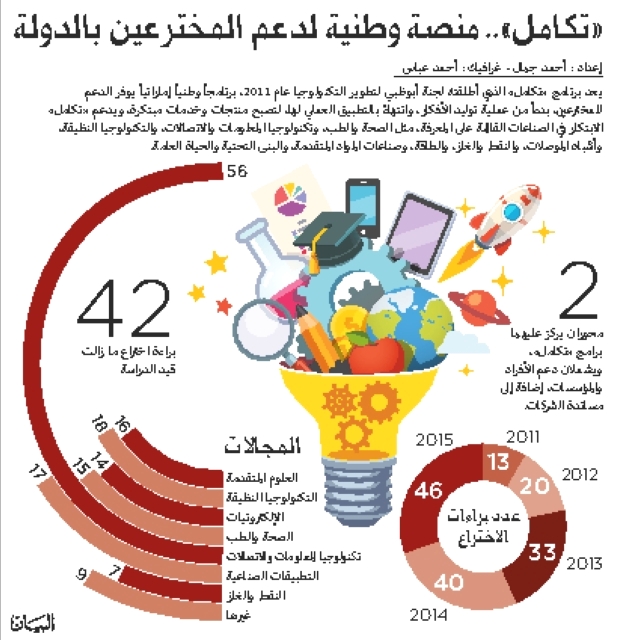 أعلن أحمد سعيد الكليلي مدير عام لجنة أبوظبي لتطوير التكنولوجيا تسجيل 194 براءة اختراع من الدولة خلال الفترة من عام 2011 وحتى العام الجاري، منها 42 براءة اختراع قيد الدراسة، حيث غطت براءات الاختراع عدداً من القطاعات الحيوية ومنها المواد المتقدمة، التكنولوجيا النظيفة، الإلكترونيات، الصحة والطب، تكنولوجيا المعلومات والاتصالات، بالإضافة إلى النفط والغاز، وتصدر قطاع تكنولوجيا المعلومات والاتصالات عدد براءات الاختراع المسجلة بإجمالي 56 براءة اختراع.