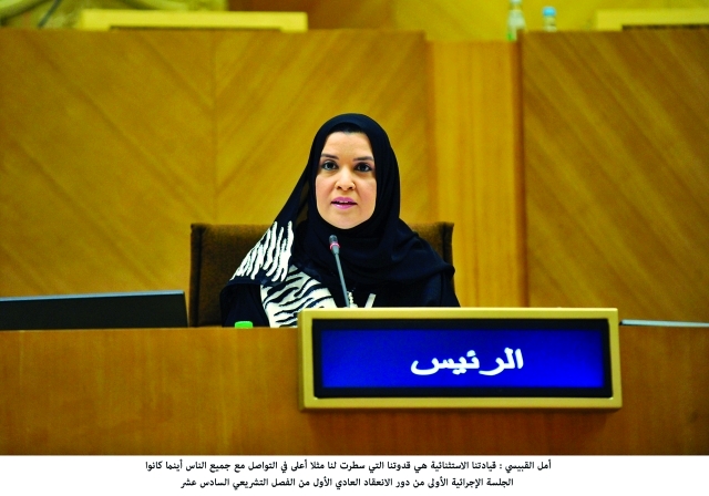 وجاء فوز معالي الدكتورة أمل القبيسي برئاسة المجلس بالتزكية، بعد أن ترشحت بمفردها لرئاسة المجلس، ولم ينافسها أعضاء آخرون وذلك في الجلسة الأولى «الإجرائية» من دور الانعقاد العادي الأول من الفصل التشريعي السادس عشر، أمس، عقب افتتاح المجلس في الجلسة التي عقدت برئاسة أكبر الأعضاء سناً وهو ماجد حمد رحمة الشامسي، والذي قام عقب إعلان فوز القبيسي بتسليمها رئاسة المجلس.
