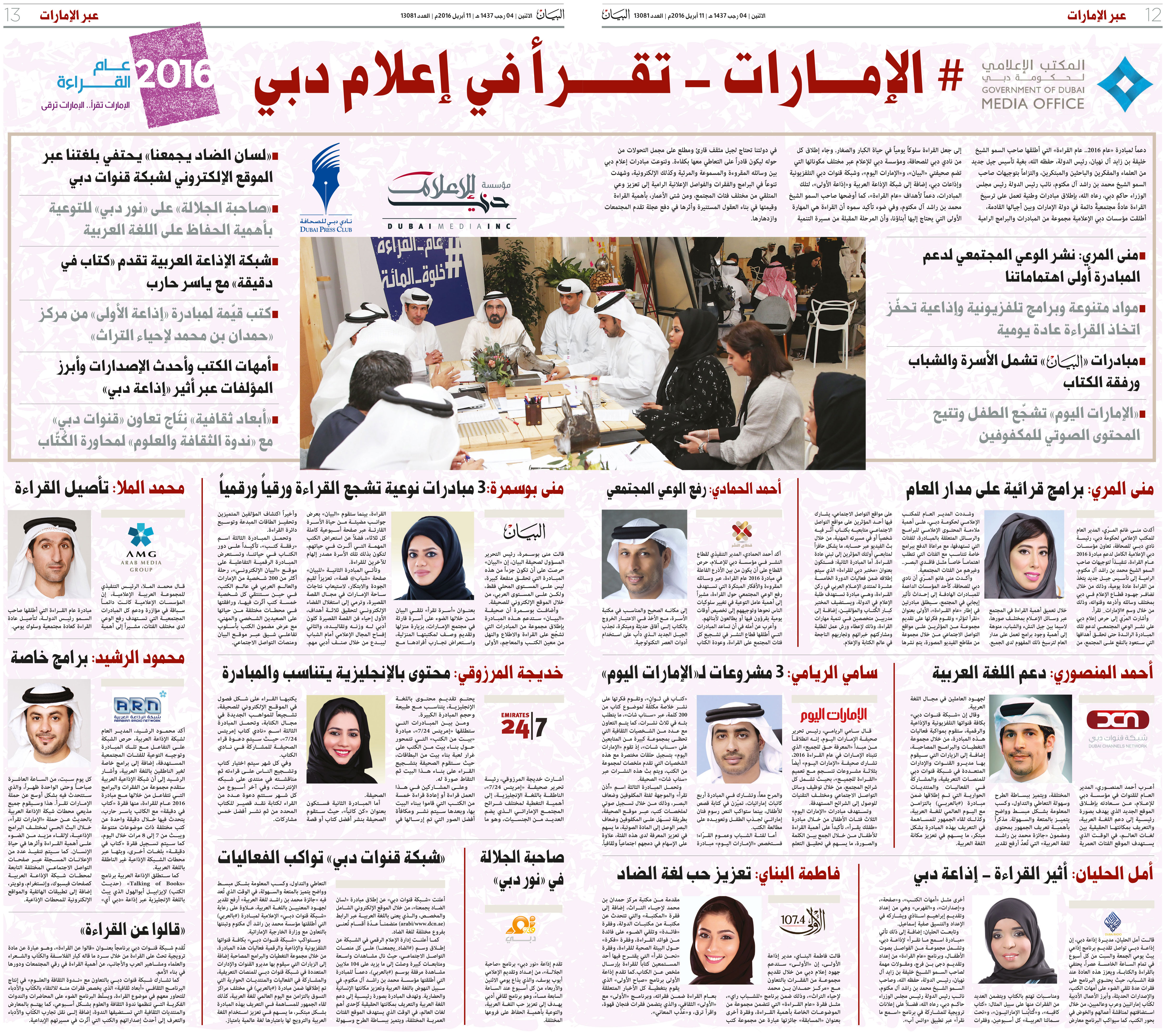 وجاء إطلاق كل من نادي دبي للصحافة، ومؤسسة دبي للإعلام عبر مختلف مكوناتها التي تضم صحيفتي «البيان»، و«الإمارات اليوم»، وشبكة قنوات دبي التلفزيونية وإذاعات دبي، إضافة إلى شبكة الإذاعة العربية و«إذاعة الأولى»، لتلك المبادرات، دعماً لأهداف «عام القراءة».