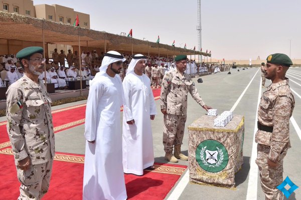 شهد سمو الشيخ حمدان بن محمد بن راشد آل مكتوم ولي عهد دبي وسمو الشيخ مكتوم بن محمد بن راشد آل مكتوم نائب حاكم دبي وسمو الشيخ سرور بن محمد آل نهيان وسمو الشيخ هزاع بن زايد آل نهيان نائب رئيس المجلس التنفيذي في أبوظبي احتفال القيادة العامة للقوات المسلحة بتخريج الدورة الخامسة من شباب الوطن المنتسبين في الخدمة الوطنية والاحتفال بالذكرى الأربعين لتوحيد قواتنا المسلحة الباسلة.