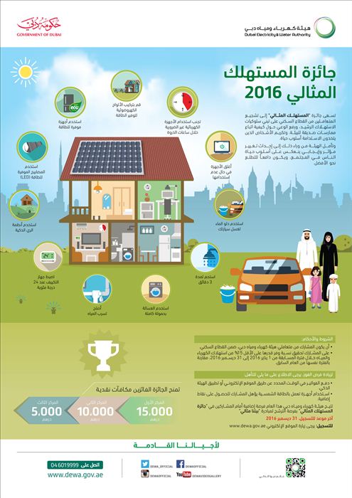 وأعلنت الهيئة أن "جائزة المستهلك المثالي" هذا العام تنقسم إلى فئتين؛ المستهلك المثالي لفئة (الفلل) والمستهلك المثالي لفئة (الشقق). وسيحظى متعاملو الهيئة ممن يحققون أعلى نسبة وفر في قيمة فواتير استهلاك الكهرباء والمياه بجوائز نقدية وشهادات تقدير من الهيئة، حيث سيحصل صاحب أكبر نسبة توفير في كل فئة على الجائزة الكبرى بقيمة 15,000 درهم، فيما سيحصل صاحب المركز الثاني على 10,000 درهم، والمركز الثالث على 5,000 درهم، بمجموع جوائز يبلغ 60 ألف درهم. ويشترط للفوز بالجائزة أن يحقق المشاركون نسبة وفر لا تقل عن 15٪ من قيمة فواتير استهلاك الكهرباء والمياه، خلال فترة المسابقة من يناير 2016 إلى نهاية ديسمبر 2016، مقارنة بالفترة نفسها من العام السابق.