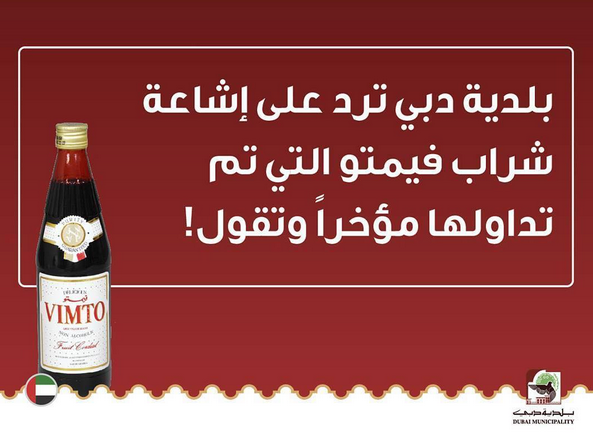 وأضاف أنه تخضع كل المنتجات المستوردة والمصنعة والمتداولة بإمارة دبي (بما في ذلك شراب فيتمو) لنظام رقابي محكم يتضمن التفتيش الميداني والتدقيق على الأنظمة المتبعة وبرنامج جمع العينات المبني على تقييم المخاطر. ولم يثبت لنا في خلال التفتيش والتدقيق الدوري أن المنتج المذكور يشكل أي خطر على صحة المستهلك. ومع ذلك وضمن الإجراءات الاحترازية التي تقوم بها بلدية دبي فقد تم جمع عينات مختلفة من منتج فيتمو المتداول وسيتم فحصه للتأكد من مطابقته للمواصفات والإجراءات المعتمدة.