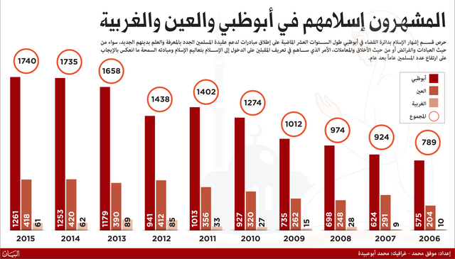 أعلنت دائرة القضاء في أبوظبي ممثلة بقسم إشهار الإسلام، أن عدد المسلمين الجدد الذين أشهروا إسلامهم من عام 2006 حتى منتصف العام الجاري «خلال 10 سنوات و6 اشهر»، بلغ 13 ألفاً و911 شخصاً.