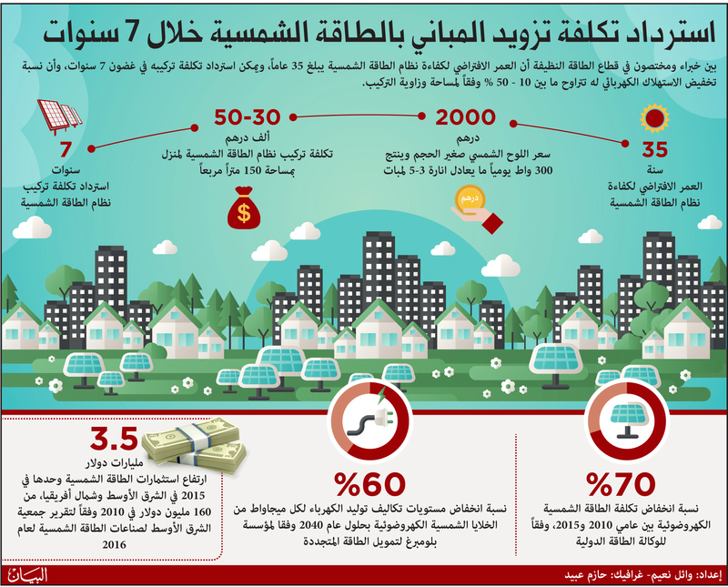 وأوضح أن الهيئة حرصت على تجهيز البنية التحتية الملائمة والسياسات، حيث أصدر سمو الشيخ حمدان بن محمد بن راشد آل مكتوم، ولي عهد دبي، رئيس المجلس التنفيذي لإمارة دبي، القرار رقم (46) لسنة 2014، والقاضي بتنظيم ربط وحدات إنتاج الكهرباء في المباني والمنازل باستخدام الطاقة الشمسية مع شبكة الكهرباء في الهيئة.