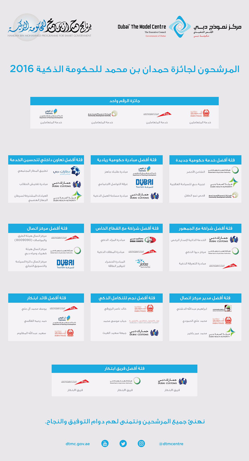 وجاء المرشحون لجائزة حمدان بن محمد للحكومة الذكية 2016 على النحو التالي :    - فئة جائزة الرقم 1 عن خدمة المتعاملين " هيئة الطرق والمواصلات " و " هيئة تنمية المجتمع " و" القيادة العامة لشرطة دبي " و " تراخيص " .