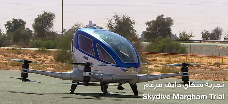 أعلنت هيئة الطرق والمواصلات بالتعاون مع شركة EHANG الصينية، عن قيامها بالتشغيل التجريبي لأول مركبة جوية ذاتية القيادة في العالم قادرة على حمل انسان EHANG184، في سماء مدينة دبي، وكشفت الهيئة أنها تعمل لوضع المركبة الجوية جيز التشغيل في شهر يوليو المقبل.