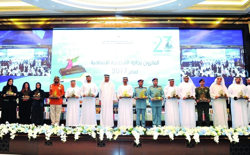 وتم خلال الحفل تكريم الفائزين بجائزة «الشخصية الاتحادية» في دورتها الخامسة، والتي يمنحها صاحب السمو الشيخ محمد بن زايد آل نهيان، ولي عهد أبوظبي، نائب القائد الأعلى للقوات المسلحة، للمكرَّمين من الشخصيات الوطنية؛ تقديراً لدورهم الوطني الذي يؤدونه بإخلاص لخدمة الأهداف الاتحادية لدولة الإمارات وهم: معالي محمد بن عبدالله القرقاوي، وزير شؤون مجلس الوزراء والمستقبل، ومعالي الدكتور أنور محمد قرقاش، وزير الدولة للشؤون الخارجية، واللواء الركن عبدالله مهير الكتبي، قائد الوحدات المساندة ـ القوات المسلحة لدولة الإمارات واللواء الركن خليفة حارب الخييلي، وكيل وزارة الداخلية المساعد لشؤون الجنسية والإقامة والمنافذ بالإنابة ـ وزارة الداخلية، واللواء الدكتور أحمد ناصر الريسي، مفتش عام وزارة الداخلية، والشيخ السفير أحمد علي المعلا، سفير دولة الإمارات في رومانيا، والسفيرة حفصة عبدالله محمد شريف العلماء، سفيرة دولة الإمارات في البرازيل، والدكتور علي بن تميم، مدير عام شركة أبوظبي للإعلام، رئيس تحرير موقع 24 الإخباري، والدكتور عبداللطيف محمد الشامسي، مدير مجمع كليات التقنية العليا، والعميد الركن علي أحمد حسن الطنيجي، من حرس الرئاسة، وجمال ماجد الغرير، رئيس مجلس إدارة شركة الخليج للسكر في دبي، وسلطان راشد الشامسي، المدير التنفيذي للشؤون الخاصة في ديوان صاحب السمو ولي عهد أبوظبي، ومبارك سالم الساعدي، من وزارة شؤون الرئاسة، بالإضافة إلى إدارة المؤتمرات في مركز الإمارات للدراسات والبحوث الاستراتيجية.