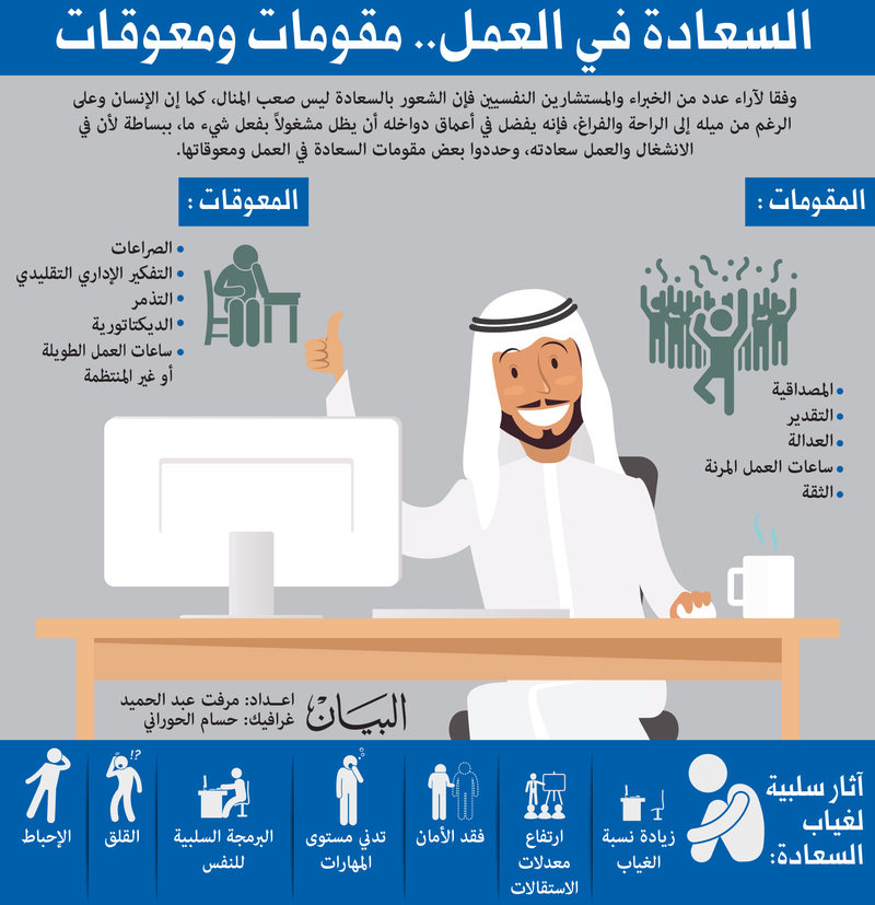 فيما حددت المستشارة الأسرية الدكتورة أمل بن جرش السويدي معوقات السعادة في العمل وهي ساعات العمل الطويلة أو غير المنتظمة وزيادة الأعباء وغيرها من أشكال الضغط بالإضافة إلى الصراعات، وكلها أسباب تنعكس سلباً على بيئة العمل وتدفع إلى زيادة التغيب عن العمل ورفع معدل الاستقالات وضعف الصحة النفسية والبدنية، وسيدفع غالبا الإطار السلبي الموظف إلى لوم الآخرين والشعور بالأسى على ذاته. وأوضحت أن الموظف يستطيع أن يتلافى كل ذلك من خلال تطوير مهاراته النفسية والاجتماعية عن طريق تنظيم توقعاته وترتيب أولوياته وعدم تحميل نفسه فوق طاقتها وتجاوز المشكلات بذكاء بتوظيفها لما فيه الخير وتحجيمها.