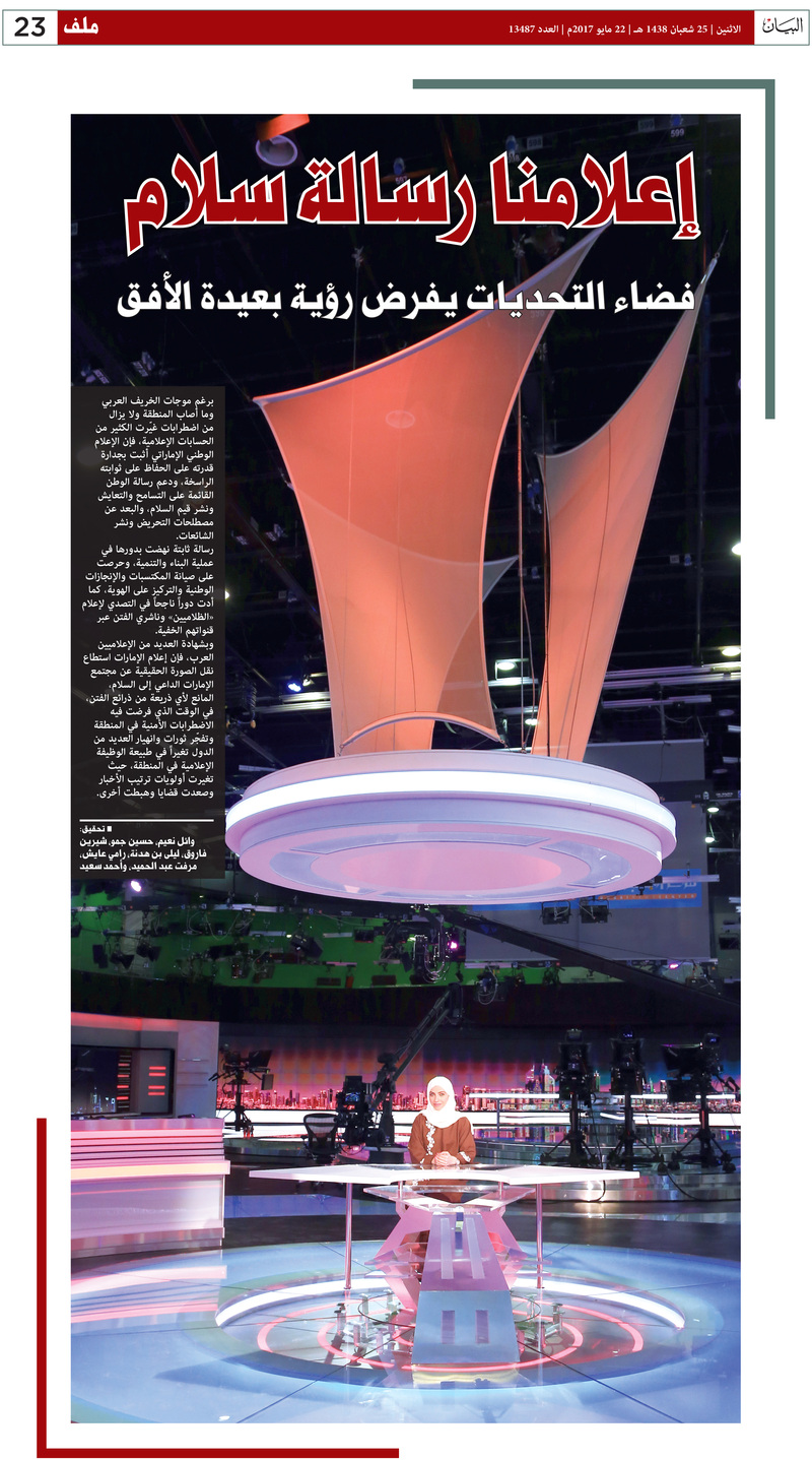 وبشهادة العديد من الإعلاميين العرب، فإن إعلام الإمارات استطاع نقل الصورة الحقيقية عن مجتمع الإمارات الداعي إلى السلام، المانع لأي ذريعة من ذرائع الفتن، في الوقت الذي فرضت فيه الاضطرابات الأمنية في المنطقة وتفجّر ثورات وانهيار العديد من الدول تغيراً في طبيعة الوظيفة الإعلامية في المنطقة، حيث تغيرت أولويات ترتيب الأخبار وصعدت قضايا وهبطت أخرى.