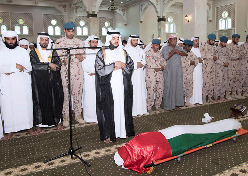 شيعت الإمارات عصر اليوم جثمان الشهيد الرقيب أول ناصر غريب المزروعي أحد جنودنا البواسل الذي انتقل إلى جوار ربه متأثرا بجراحه إثر إصابة سابقة خلال مشاركته في عملية "إعادة الأمل" مع قوات التحالف العربي لدعم الشرعية في اليمن بقيادة المملكة العربية السعودية.