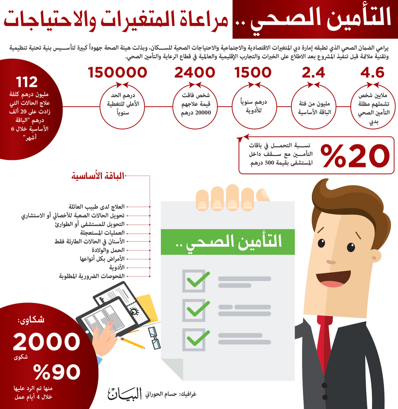 يمثل التأمين الصحي لفئتي العمال والخدم حماية للطرفين من أي نفقات محتملة في الظروف الصحية غير المتوقعة، وأشار الدكتور حيدر سعيد اليوسف مدير إدارة التمويل الصحي بهيئة الصحة بدبي إلى أن عدد المؤمّن عليهم ممن يحملون إقامة دبي بلغ نحو 4.6 ملايين، بما يعادل نحو 99% من المشمولين بنظام التأمين الصحي، وتحسب الهيئة غرامة 500 درهم شهرياً عن كل شخص غير مؤمّن عليه، تدفع أثناء تجديد أو إلغاء الإقامة.