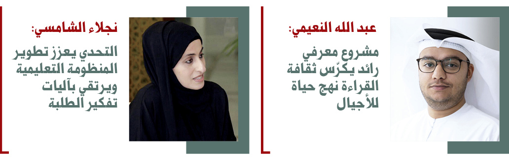 وبينت الشامسي أهمية العلاقة بين «تحدي القراءة العربي» والمدرسة، على أكثر من مستوى: «من خلال تحول التحدي إلى نشاط مدرسي دائم، ستشهد المنظومة التعليمية تطوراً نوعياً في أدوات التعليم وأساليبه، كما ستساعد المعارف المكتسبة من خلال القراءة اللامنهجية الطالب العربي على تطوير آليات تفكير جديدة وبناء قدرات تحليلية ونقدية تنعكس إيجابياً على طريقة استيعابه المنهاج المدرسي.