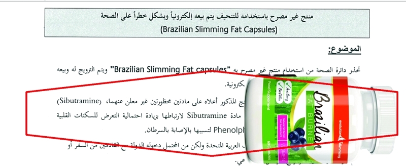 وأضافت أن نتائج التحاليل المختبرية أثبتت احتواء هذا المنتج على مادتين محظورتين غير معلن عنهما على علبة المنتج أو في النشرة الداخلية وهما: مادتي «سيبوترامين» و «فينولفثالين»، حيث تم حظر المادة الأولى عالمياً لارتباطها بزيادة احتمالية التعرض للسكتات القلبية والجلطات المميتة، كما أن المادة الثانية محظورة لتسببها في الإصابة بالسرطان.