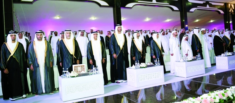 وبدأت مراسم الاحتفال بعزف السلام الوطني بأداء الفرق الموسيقية لشرطة أبوظبي ودبي والشارقة ورأس الخيمة تلاها فقرة تلاوة آيات عطرة من القرآن الكريم.