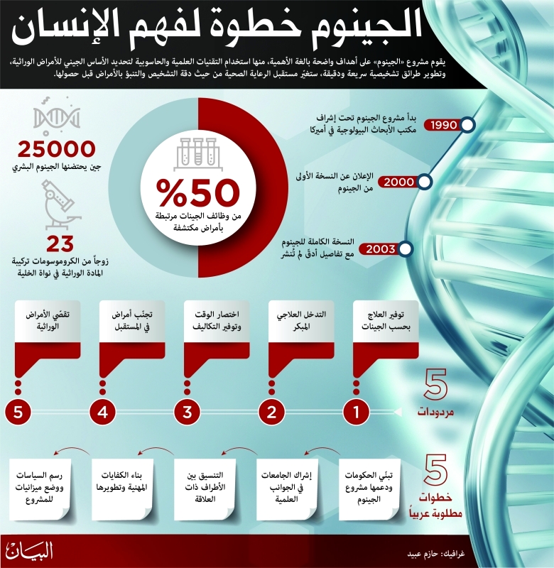 رغم أن العديد من دول العالم اتجهت لدراسة الجينوم البشري لشعوبها منذ بداية التسعينيات من القرن الماضي للوقاية من الأمراض الجينية وتسخيرها للتقنيات الحديثة المبتكرة، للتعرف على البصمة الجينية والوصول إلى علاج شخصي لكل مريض، حسب العوامل الوراثية، إلا أن الجينوم الخاص بالشعوب العربية بشكل كامل لا يزال في غرف الإنعاش التي قد تمتد ربما لعقود مقبلة.