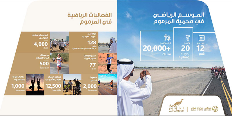 ويشمل الموسم الرياضي في المرموم أيضاً «طواف دبي الدولي للدراجات الهوائية» الذي ينظمه مجلس دبي الرياضي ومسابقة «ساندستورم للعوائق» التي تشمل سلسلة من التحديات المثيرة والمليئة بالصعوبات وتستلزم قدرات بدنية عالية.
