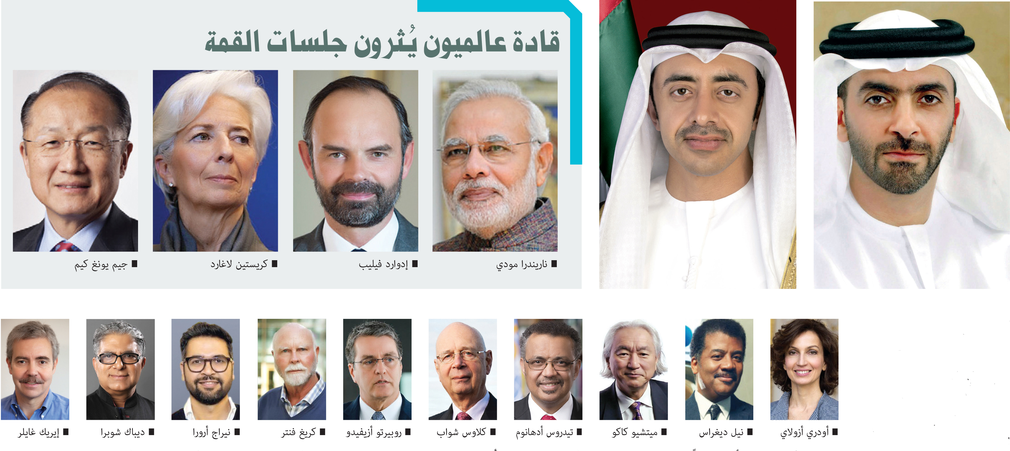 إلى ذلك تستضيف القمة عدداً من مشاهير ونجوم العالم كمتحدثين في فعالياتها المختلفة، من بينهم النجمان الأميركيان روبرت دي نيرو وفوريست ويتيكر والمغني العالمي ويل آي آم، كنجوم يتبنّون مشاريع إنسانية، بالإضافة إلى عالم الفيزياء الفلكية نيل ديغراس تايسون، صاحب البرنامج التلفزيوني الشهير المختص بعلم الفلك بعنوان «كوزموس»، والباحث في قسم الفيزياء الفلكية في متحف التاريخ الطبيعي بنيويورك.
