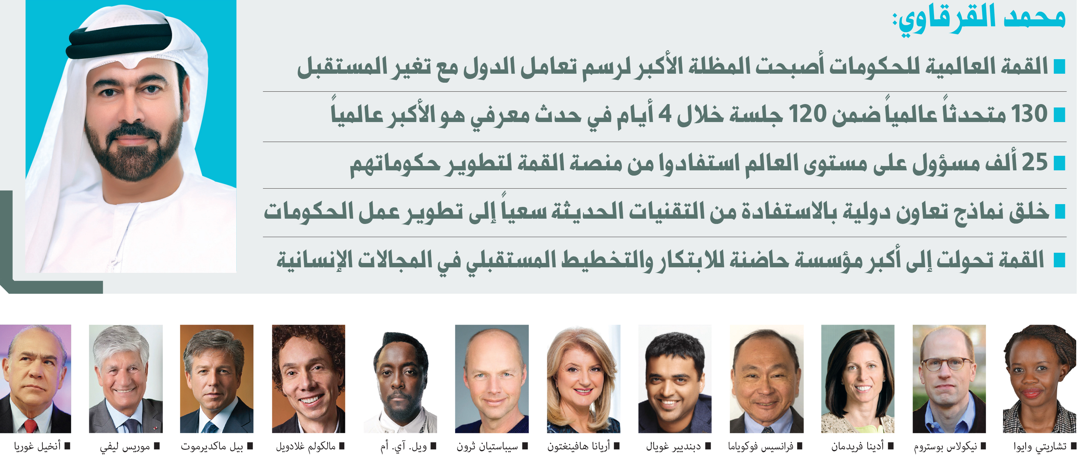 وقال معالي محمد عبدالله القرقاوي وزير شؤون مجلس الوزراء والمستقبل، رئيس القمة العالمية للحكومات، إن «القمة العالمية للحكومات أصبحت منصة معرفية دائمة لكافة الحكومات وفعالياتها مستمرة على مدار العام.. وشراكاتها في تطور مستمر مع كافة المنظمات الدولية»، مؤكداً: «بتوجيهات محمد بن راشد.. القمة العالمية للحكومات أصبحت المظلة الأكبر دولياً لرسم تعامل الحكومات مع تغير المستقبل».