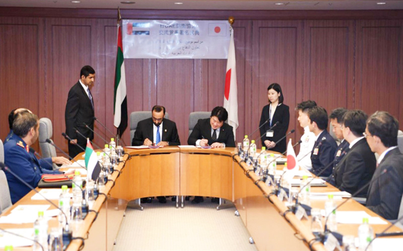 وقّع معالي محمد بن أحمد البواردي الفلاسي، وزير الدولة لشؤون الدفاع، وتوموهيرو ياماموتو، وزير الدولة للدفاع الياباني، اتفاقية تعاون مشترك بين دولة الإمارات واليابان في شؤون الأمن والدفاع.