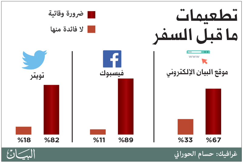 ذهب غالبية المستطلعة آراؤهم أن التطعيمات قبل السفر ضرورة وقائية خاصة أنها توفر وقاية خاصة لكبار السن والأطفال والحوامل من الأمراض والأوبئة المنتشرة في بعض البلدان، فيما ذهبت فئة قليلة على أنها معلومات مغلوطة تنم عن عدم الوعي بأهمية التطعيمات حسب خبراء الجهات الصحية، حيث شكلت 67% من رواد «البيان» الإلكتروني أنها ناجعة فيما ذهب 33% أنها لا فائدة منها، فيما ذهب 89% على موقع التواصل الاجتماعي فيسبوك أنها ضرورة وقائية، بينما ذهب 11% أنها لا فائدة منها، فيما ذهب 82% من زوار موقع التواصل الاجتماعي تويتر أنها ضرورة في حين ذهب 18% أنها لا فائدة منها.