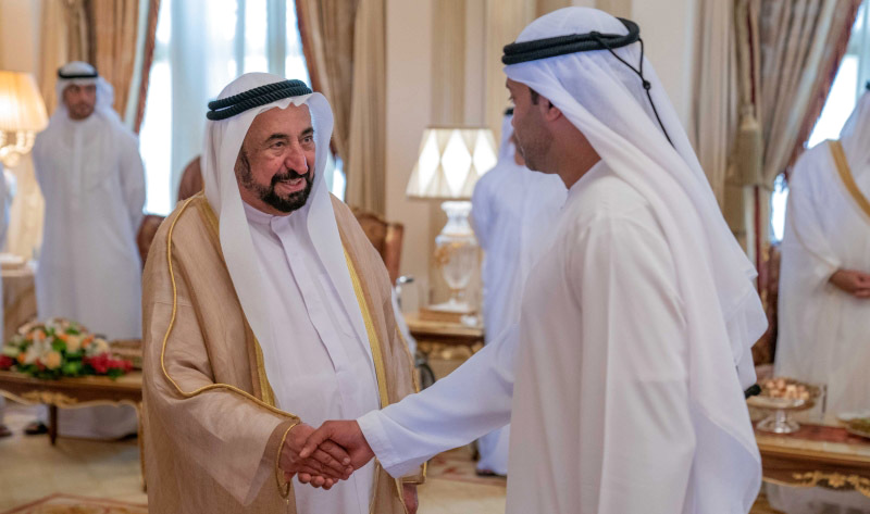 حضر الاستقبالات الشيخ فيصل بن خالد بن سلطان القاسمي والشيخ خالد بن عبدالله القاسمي رئيس دائرة الموانئ البحرية والجمارك والشيخ سالم بن عبدالرحمن القاسمي رئيس مكتب سمو الحاكم والشيخ فاهم بن سلطان القاسمي رئيس دائرة العلاقات الحكومية والشيخ محمد بن حميد القاسمي مدير دائرة الإحصاء والتنمية المجتمعية ومعالي عبدالرحمن بن محمد العويس وزير الصحة ووقاية المجتمع وراشد أحمد بن الشيخ رئيس الديوان والأميري واللواء سيف الزري الشامسي قائد عام شرطة الشارقة وعدد من أعضاء المجلسين التنفيذي والاستشاري لإمارة الشارقة.
