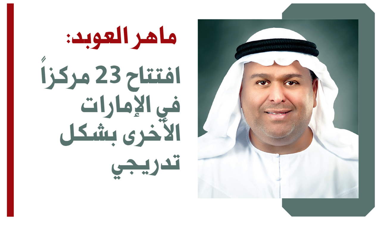 وقال العوبد: إنه سيتم افتتاح 23 مركزاً أخرى في الإمارات الأخرى بشكل تدريجي ليصل مجموع المراكز مع نهاية العام الحالي 37 مركزاً على مستوى الدولة.
