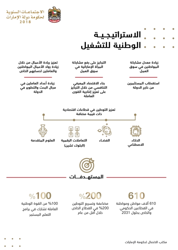 أطلقت حكومة دولة الإمارات الاستراتيجية الوطنية للتشغيل 2031، الهادفة إلى استقطاب وتأهيل القدرات والطاقات البشرية المواطنة وتمكين مشاركتها وحضورها في سوق العمل، وبناء اقتصاد معرفي بإنتاجية عالية لتحقيق ريادة الأعمال وتعزيز مكانة الدولة وتنافسيتها في المؤشرات العالمية.