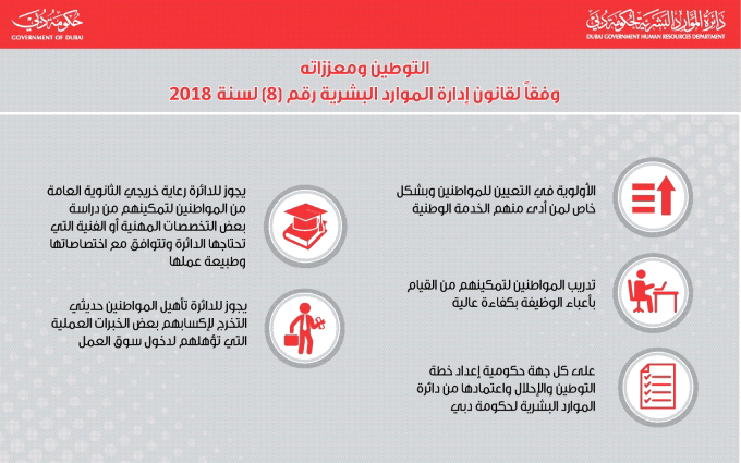 استحدث قانون الموارد البشرية لحكومة دبي رقم 8 لسنة 2018، ضمن الفصل الخامس منه، العديد من المواد التي تتعلق بالأولية في التعيين للمواطنين، ورعاية خريجي الثانوية العامة، وتأهيل حديثي التخرج، وكذلك التدريب الميداني، لا سيما أن القانون رقم (27) لسنة 2006 وتعديلاته لم يُفرد فصلاً خاصاً بالتوطين، ولم يتطرق إلى كثير من مسائله.