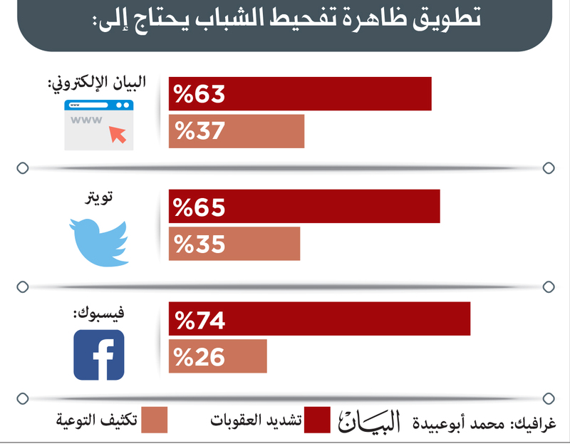 وفي ذات الاستطلاع، لكن عبر موقع «البيان الإلكتروني»، أجاب 63% من المستطلعة آراؤهم أن تشديد العقوبات وتطبيقها بشكل صارم على المفحطين هو الحل الأنسب للقضاء على هذه الظاهرة الخطرة، بينما قال 37% منهم، إن التوعية هي الحل الناجح للسيطرة على هوس الشباب بهذه الممارسة الخطرة.