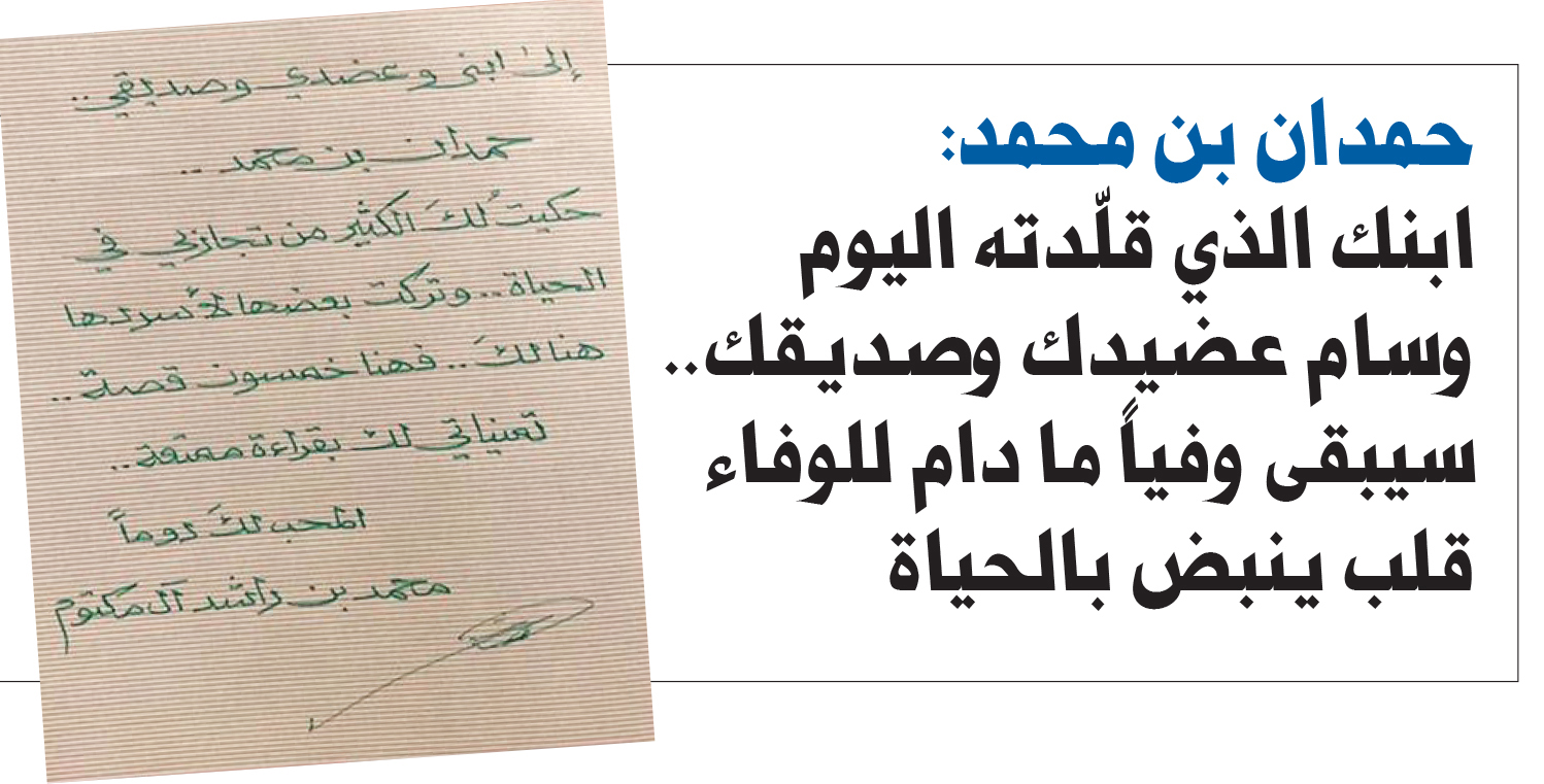 ودوّن سمو الشيخ حمدان بن محمد بن راشد آل مكتوم، ولي عهد دبي رئيس المجلس التنفيذي، عبر حسابه في تويتر، مخاطباً صاحب السمو الشيخ محمد بن راشد آل مكتوم، نائب رئيس الدولة رئيس مجلس الوزراء حاكم دبي، رعاه الله: «ابنك الذي قلّدته اليوم وسام عضيدك وصديقك.. سيبقى وفياً ما دام للوفاء قلب ينبض بالحياة»..