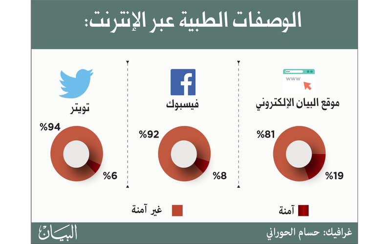 أما على موقع «البيان الإلكتروني» فقد أكد 81% من المستجيبين أن الوصفات الطبية عبر الإنترنت غير آمنة، بينما أجاب 19% منهم أنها آمنة.