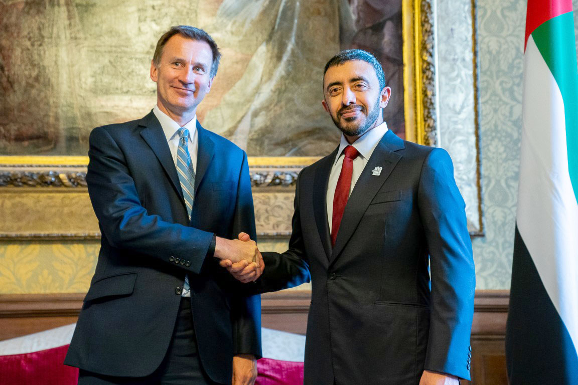 من جانبه رحب معالي جيرمي هانت وزير الخارجية البريطاني بزيارة سمو الشيخ عبدالله بن زايد آل نهيان، مؤكدا أن العلاقات بين البلدين استراتيجية وراسخة وهناك حرص على تعزيزها وتنمية أوجه التعاون المشترك في العديد من المجالات.