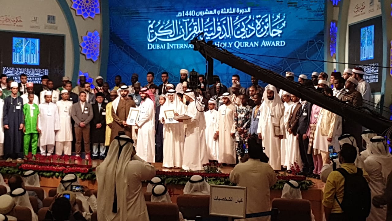 شهد سمو الشيخ منصوربن محمد بن راشد آل مكتوم، مساء اليوم الحفل الختامي لجائزة دبي الدولية للقرآن الكريم، وإعلان الفائزين بالمراكز الـ10 الأولى في مسابقة الجائزة، زيادة على تكريم معالي جمعة الماجد بجائزة "الشخصية الإسلامية " لدورة التسامح، بحضور إبراهيم بوملحة، مستشار صاحب السمو حاكم دبي للشؤون الثقافية والإنسانية رئيس اللجنة المنظمة للجائزة، وعدد من السفراء والقناصل، وأعضاء لجنتي التنظيم والتحكيم والمتسابقين.