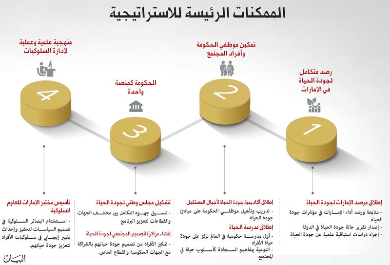 وأشارت إلى أن الاستراتيجية تتضمن مجموعة من الممكنات لترسيخ نموذج عمل جديد، يضع جودة الحياة في صميم العمل الحكومي، من خلال أدوات عملية تركز على تعزيز مكانة دولة الإمارات وريادتها في مؤشرات جودة الحياة عالمياً، تشمل الرصد المتكامل لجودة الحياة في دولة الإمارات، وتمكين موظفي الحكومة وأفراد المجتمع من مفاهيم وممارسات جودة الحياة، وترسيخ نموذج الحكومة كمنصة واحدة، تتكامل فيها أدوار الجهات لتعزيز جودة الحياة، إضافة إلى تطوير منهجية علمية وعملية لإدارة السلوكيات، لتمكين السياسات والبرامج الحكومية الداعمة لجودة الحياة.