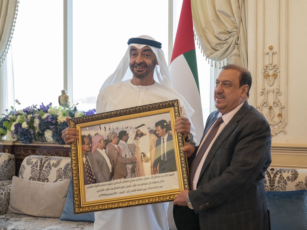 وأهدى رئيس مجلس النواب اليمني.. صاحب السمو الشيخ محمد بن زايد آل نهيان صورة تعود للمغفور له الشيخ زايد بن سلطان آل نهيان " طيب الله ثراه " وهو يصافح سلطان البركاني لدى وصوله موقع سد مأرب التاريخي قبيل حفل تدشين السد بعد إعادة بنائه على نفقة الشيخ زايد يوم 20 ديسمبر عام 1986.