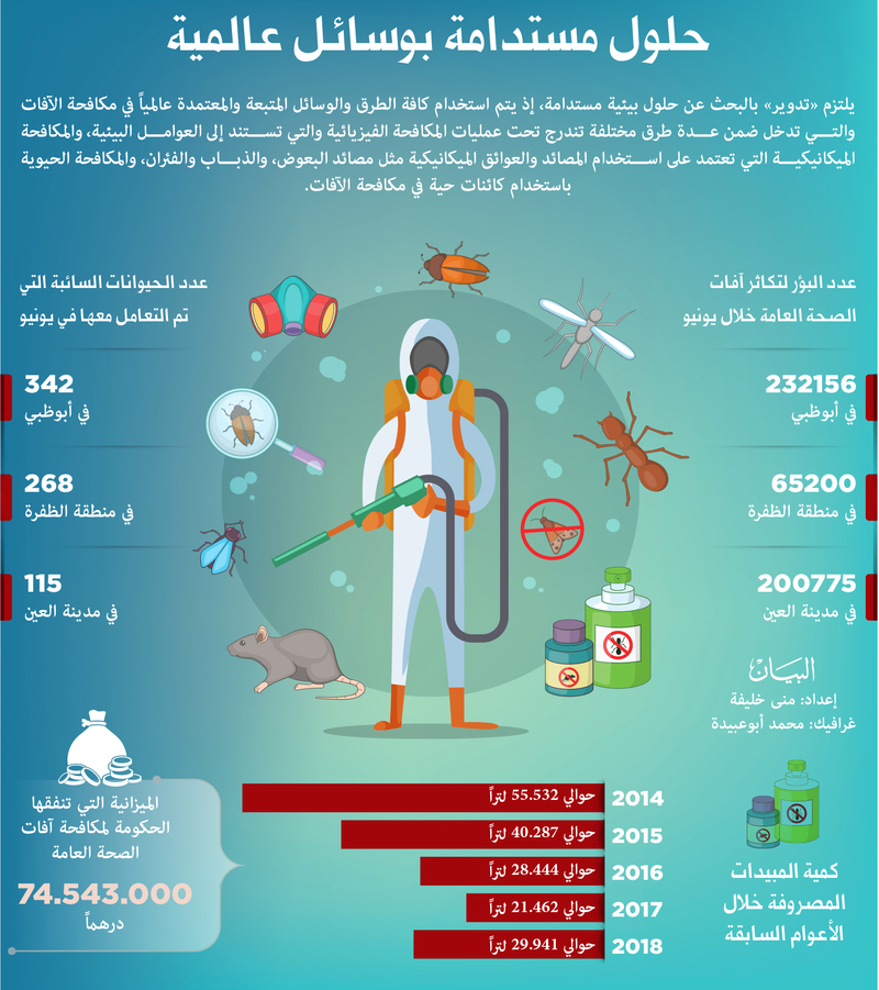 وأشار المهندس محمد المرزوقي، مدير إدارة آفات الصحة العامة، إلى أنه تم التركيز على عمليات المسح الميدانية للآفات والقيام بعملية رصدها من خلال مصائد جاذبة متخصصة تم توزيعها على مناطق جغرافية تمثل مختلف مناطق الإمارة مما ساهم في توجيه العمل والقيام بعملية المكافحة في حال رصد الإصابة، هذا وتم التركيز على استخدام المواد الصديقة للبيئة ذات الأثر المتبقي الطويل والتركيز على عمليات المكافحة الميكانيكية والفيزيائية للآفة وتصحيح أسباب تواجد الآفة من خلال التنسيق مع الجهات المعنية لإزالة أسباب تواجدها، مثل تجفيف المستنقعات المائية، وإزالة التراكمات العضوية والنباتات والأعشاب المهملة التي تشكل مأوى مناسباً للعديد من الآفات وغيرها من الأسباب الأخرى مما يؤدي إلى تقليل مصادر تكاثر الآفات وبالتالي تقليل المبيدات المستخدمة في عمليات المكافحة، ويأتي ذلك بالتزامن مع عملية التوعية المستمرة للجمهور والذي له الأثر الكبير على وجود بيئة نظيفة وخالية من الآفات، إذ تقدر الكلفة السنوية التقديرية للمبيدات المستخدمة بـ 4 ملايين درهم بخفض مالي يقدر بنسبة من 25-30% مقارنة بالسنوات السابقة.