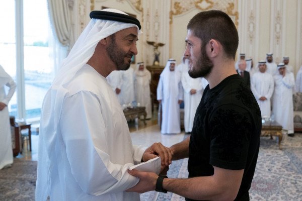 استقبل صاحب السمو الشيخ محمد بن زايد آل نهيان ولي عهد أبوظبي نائب القائد الأعلى للقوات المسلحة اليوم في قصر البحر المصارع العالمي حبيب نور محمدوف بطل العالم للوزن الخفيف في اتحاد الفنون القتالية المختلطة " UFC " الذي توج بطلا للنزال الرئيس في بطولة " UFC "