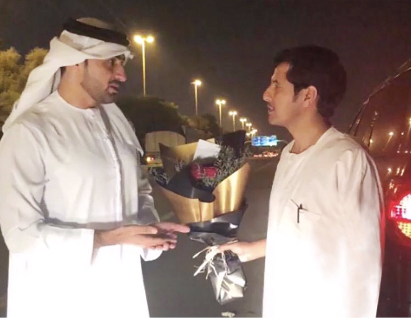 وفي طريق العودة تلقى إتصالاً هاتفياً من أحد ضباط شرطة الشارقة يبلغه بأنهم في طريقهم إليه مع البطاقة حيث فوجيء بكل من المقدم عبدالرحمن خاطر والنقيب سعود الشيبة من فرع التوعية والإعلام المروري بإدارة المروروالدوريات بشرطة الشارقة وهما يستوقفانه على الطريق لاستلام البطاقة ومعهما باقة ورد قبل وصوله إلى العاصمة أبوظبي مشيداً برجال شرطة الشارقة ، ومعرباً عن شكره لهم على اهتمامهم وسرعة تجاوبهم مع الاتصال وحل مشكلته .