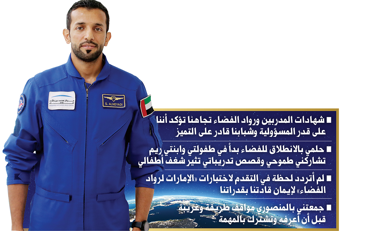 ولفت النيادي في تصريحات لـ«البيان» إلى أنهما على قدر التحدي والمسؤولية التي ألقيت على عاتقهما، من وقت الإعلان عن اختيارهما ليكونا أول رائدي فضاء إماراتيين، مشيراً إلى أنهما يكملان بعضهما البعض، وأن وجوده بديلاً للمنصوري يعكس ويؤكد الجاهزية المطلقة لكليهما، ونجاحهما في الوصول إلى أعلى درجات التدريب، وهذا بشهادة المسؤولين ورواد الفضاء الذين أشرفوا على اختباراتهما وبرنامجهما التدريبي العام الماضي.