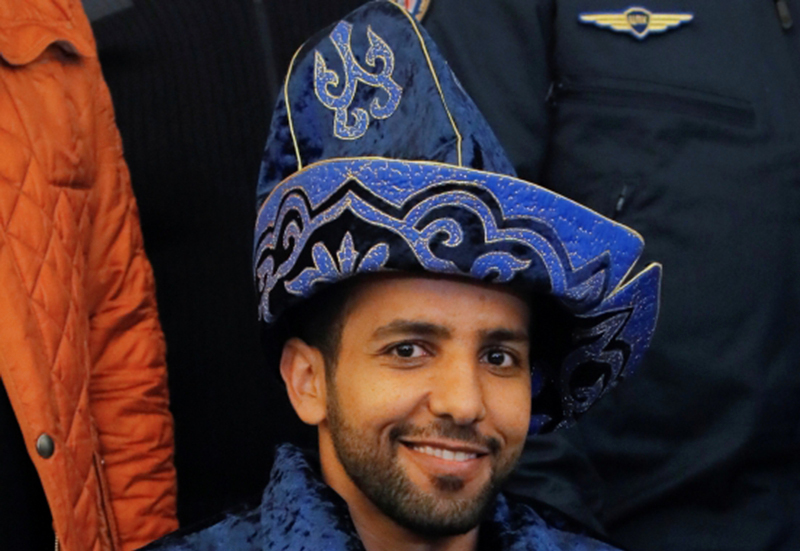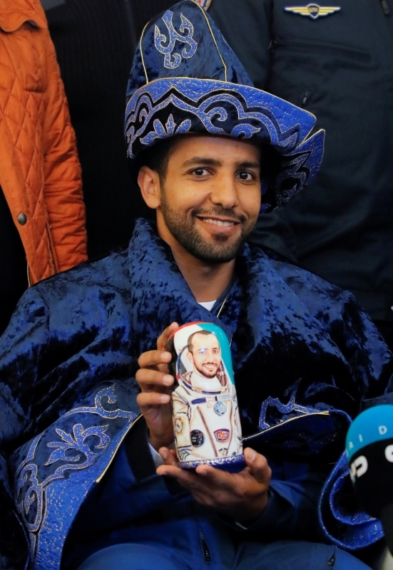 وظهر المنصوري وهو يرتدي اللباس الكازاخي التقليدي في تقليد روسي معتمد بعد المهمات الفضائية.